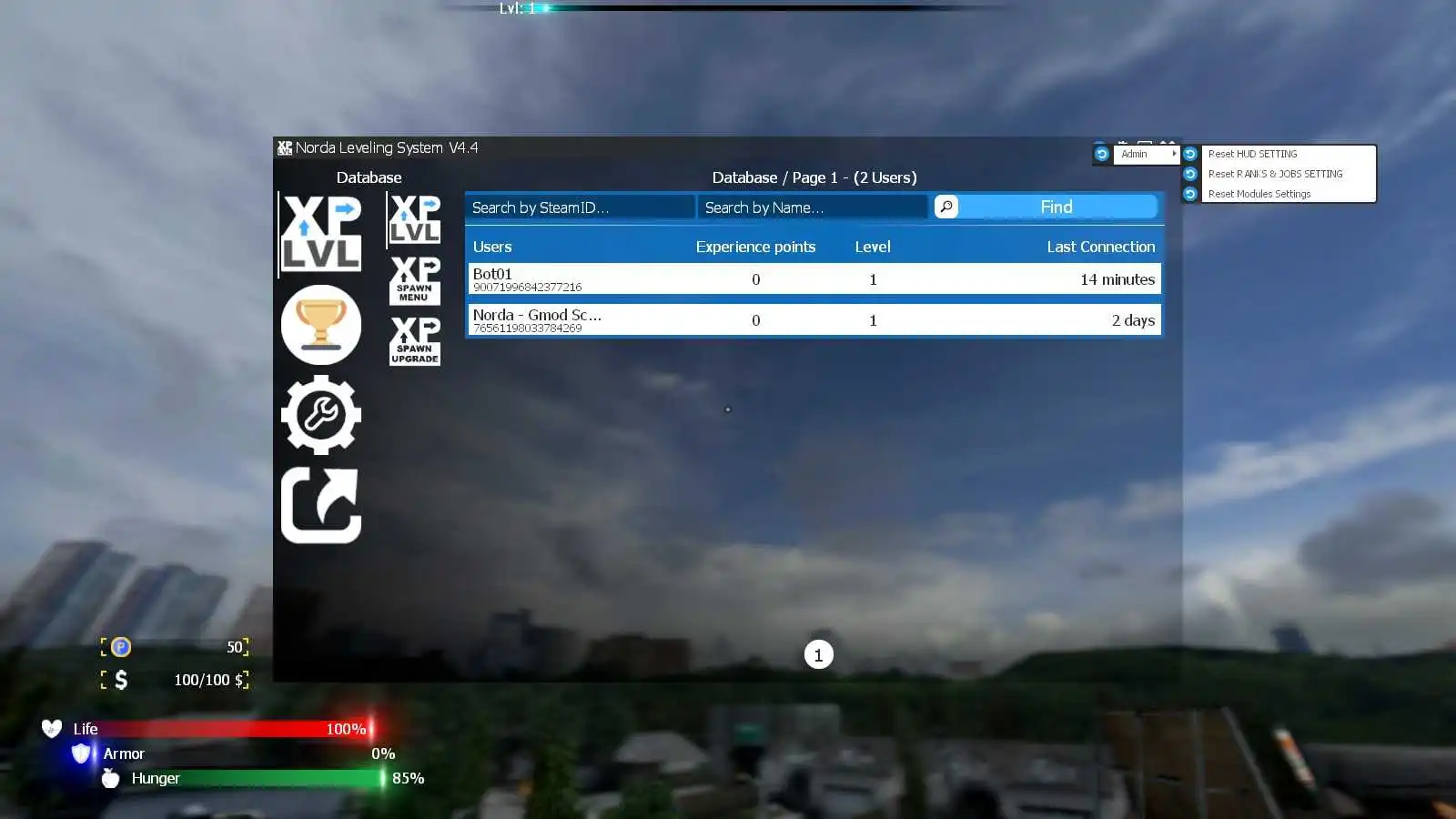 Gmod Leveling System is a leveling system for your Gmod or DarkRP servers, which means that it works as well with or without DarkRP. It allows you to add a leveling system and a management of experience points and a ranking of players from the highest level to the lowest to animate the competition on your servers, to manage the level of all your players even without an administration system, you just have to be admin to access the management interface, you can customize in real time the Progress Bar on the HUD, that is to say the horizontal position, vertical, width, length, and the colors, text.